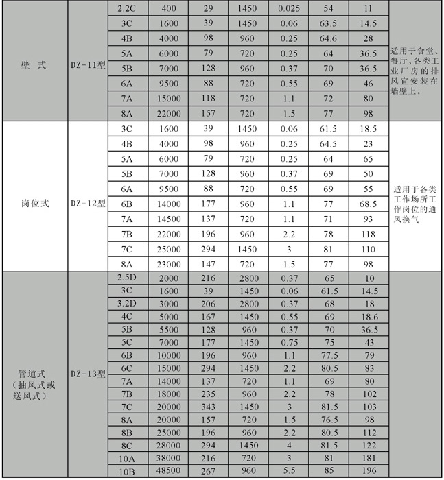 型:FDZ為防腐型軸流通風(fēng)機(jī),用于輸送有腐蝕性的氣體;BDZ為防爆型軸流通風(fēng)機(jī),用于輸送易燃易爆的氣體。
